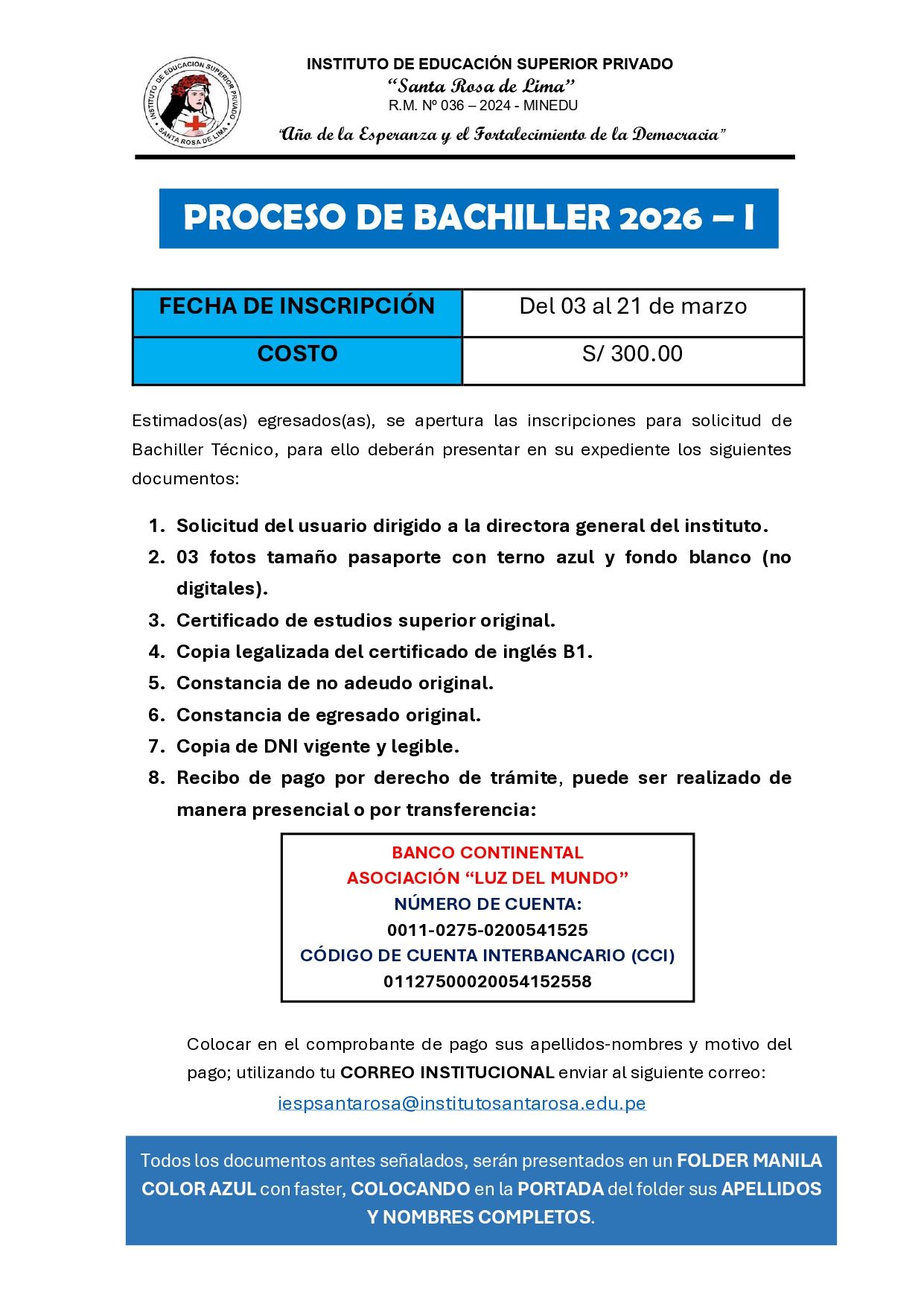 El IESP “Santa Rosa de Lima”, convoca al Proceso de Bachiller 2026-I para los egresados del programa de estudios de Enfermería Técnica